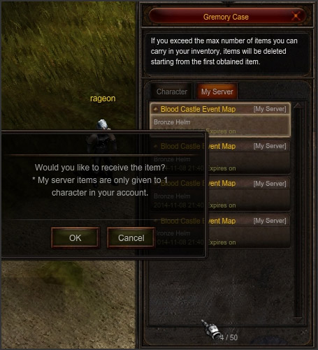 Items from GM - The items received from GM are stored in either Character Storage or Server Storage.